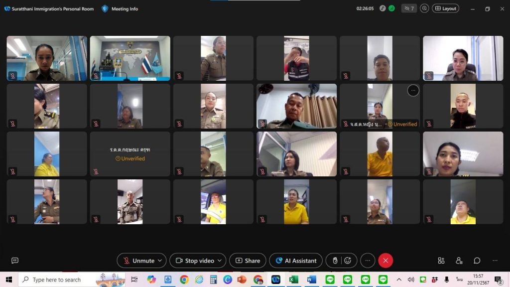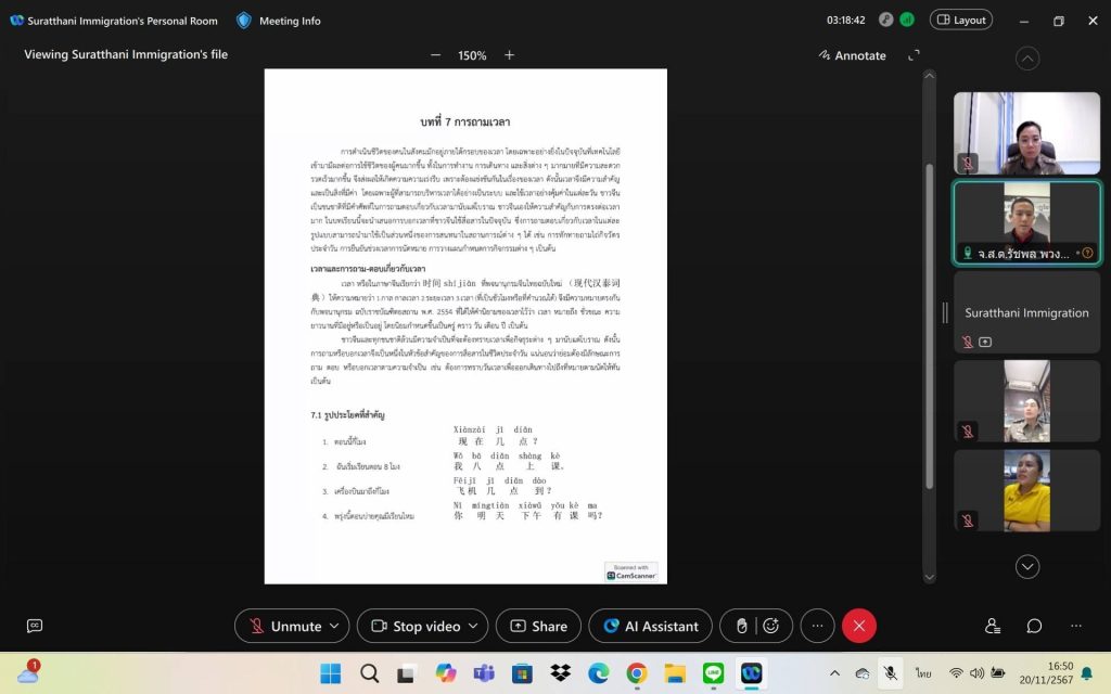 วันที่ 20 พ.ย.67 เวลา 16.00 – 17.00 น. ข้าราชการตำรวจในสังกัด ตม.จว.สุราษฎร์ธานี (ระดับ ผบ.หมู่ – สว.) ได้เข้ารับการอบรมภาษาจีนเบื้องต้น ตามโครงการ “อบรมภาษาจีนเพื่อการสื่อสารงานตรวจคนเข้าเมือง” ผ่านระบบการประชุมทางไกล Webex เพื่อให้มีความรู้ ความเข้าใจ และทักษะในการติดต่อสื่อสารกับผู้โดยสารและผู้มารับบริการชาวจีน โดยมี จ.ส.ต.รัชพล พวงจำปา ผบ.หมู่ ตม.จว.สุราษฎร์ธานี เป็นวิทยากร