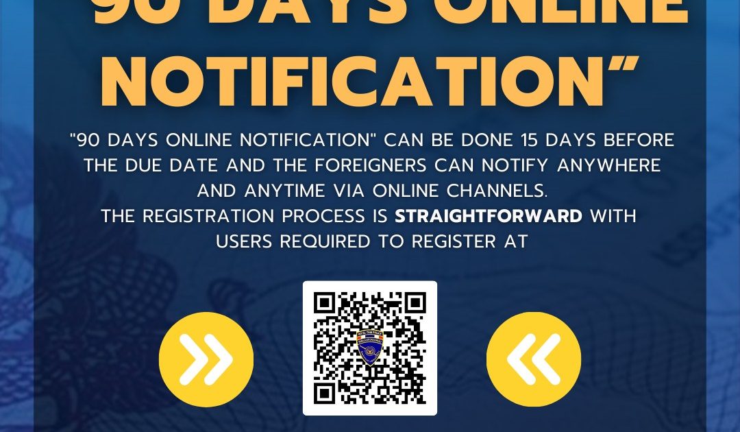 โครงการแจ้งที่พักอาศัยเมื่ออยู่ในราชอาณาจักรเกิน 90 วัน ออนไลน์ โดยสามารถแจ้งได้ล่วงหน้า 15 วันก่อนถึงวันครบกำหนด สามารถแจ้งได้ทุกที่ ทุกเวลา ผ่านช่องทางออนไลน์ที่ www.immigration.go.th หรือ QR CODE ด้านล่าง
