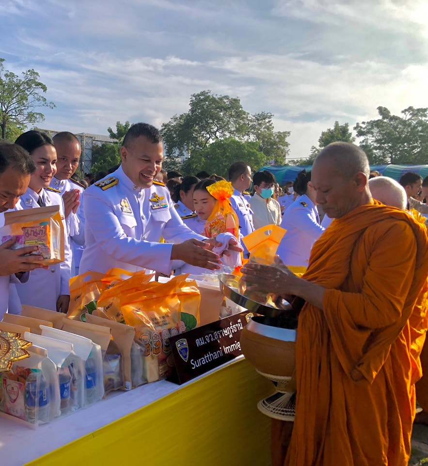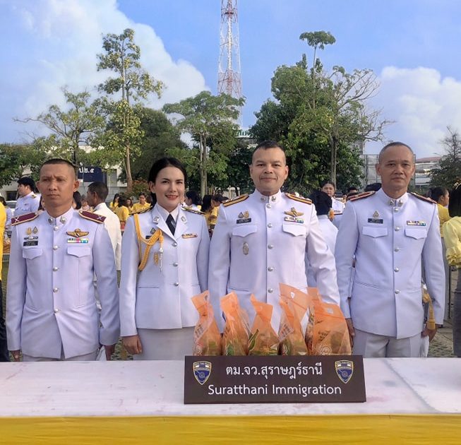 วันที่ 13 ต.ค. 66 พ.ต.อ.ศุภฤกษ์ พันธ์โกศล ผกก.ตม.จว.สุราษฎร์ธานี มอบหมายให้ พ.ต.ท.พิงคะรัตน์ ซ้ายขวัญ รอง ผกก.ตม.จว.สุราษฎร์ธานี พร้อมด้วยข้าราชการตำรวจในสังกัด ตม.จว.สุราษฎร์ธานี เข้าร่วมพิธีทำบุญตักบาตรและวางพวงมาลา เนื่องในวันนวมินทรมหาราช ณ ศาลากลางจังหวัดสุราษฎร์ธานี อ.เมืองสุราษฎร์ธานี จว.สุราษฎร์ธานี โดยมี นายเจษฎา จิตรัตน์ ผู้ว่าราชการจังหวัดสุราษฎร์ธานี เป็นประธานในพิธี