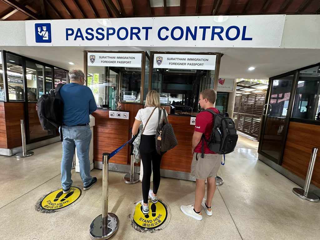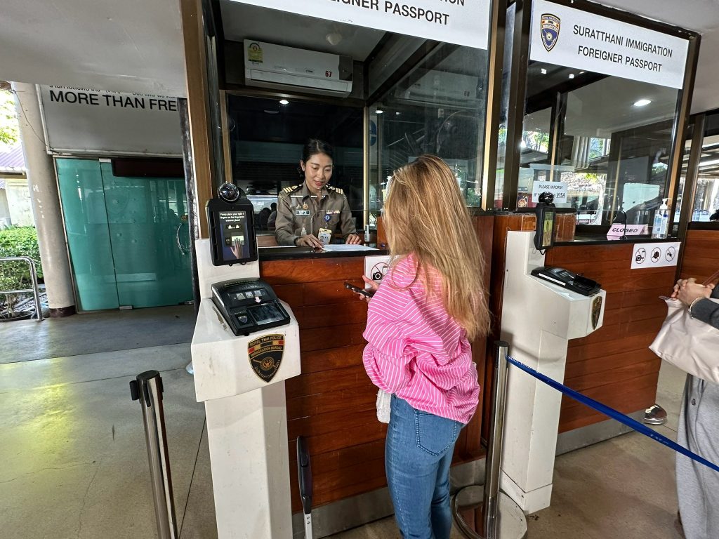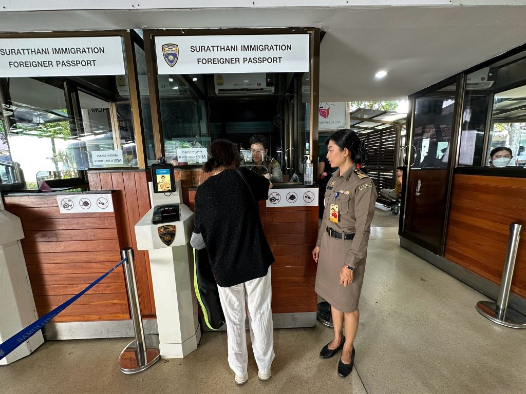 วันที่ 15 มี.ค.68 ร.ต.อ.ธฤติพัฒน์ สมมะลวน รอง สว.ตม.จว.สุราษฎร์ธานี ,ร.ต.อ.หญิง ภาวดี หวานทอง ,ร.ต.อ.หญิง จันทร์จิรา วิถี พร้อมด้วยเจ้าหน้าที่ ตม.จว.สุราษฎร์ธานี (ทอ.สมุย) ปฏิบัติหน้าที่ตรวจบุคคลและพาหนะทางอากาศ, Overstay, Visa on arrival พร้อมดูแล ช่วยเหลือ อำนวยความสะดวกและความเรียบร้อยในแถวระหว่างรอเข้าใช้บริการให้กับผู้โดยสารที่เดินทางเข้า-ออก ทางอากาศในเขตพื้นที่รับผิดชอบประจำสนามบินสมุย อ.เกาะสมุย จว.สุราษฎร์ธานี