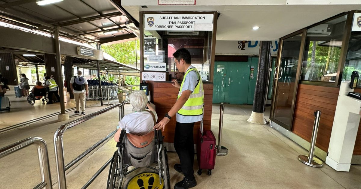 วันที่ 15 มี.ค.68 ร.ต.อ.ธฤติพัฒน์ สมมะลวน รอง สว.ตม.จว.สุราษฎร์ธานี ,ร.ต.อ.หญิง ภาวดี หวานทอง ,ร.ต.อ.หญิง จันทร์จิรา วิถี พร้อมด้วยเจ้าหน้าที่ ตม.จว.สุราษฎร์ธานี (ทอ.สมุย) ปฏิบัติหน้าที่ตรวจบุคคลและพาหนะทางอากาศ, Overstay, Visa on arrival พร้อมดูแล ช่วยเหลือ อำนวยความสะดวกและความเรียบร้อยในแถวระหว่างรอเข้าใช้บริการให้กับผู้โดยสารที่เดินทางเข้า-ออก ทางอากาศในเขตพื้นที่รับผิดชอบประจำสนามบินสมุย อ.เกาะสมุย จว.สุราษฎร์ธานี