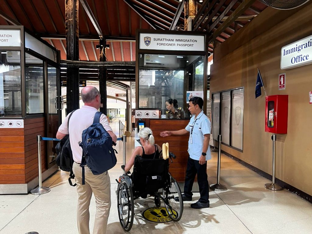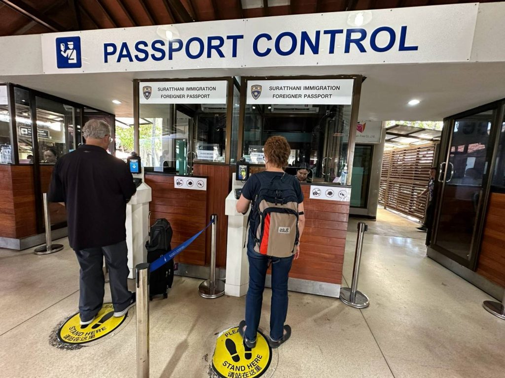 วันที่ 18 มี.ค.68 ร.ต.อ.หญิง ภาวดี หวานทอง ,ร.ต.อ.ธฤติพัฒน์ สมมะลวน,ร.ต.อ.หญิง จันทร์จิรา วิถี รอง สว.ตม. จว.สุราษฎร์ธานี พร้อมด้วยเจ้าหน้าที่ ตม.จว. สุราษฎร์ธานี (ทอ.สมุย) ปฏิบัติหน้าที่ตรวจบุุคคลและพาหนะทางอากาศ, Overstay, Visa on arrival พร้อมดูแล ช่วยเหลือ อำนวยความสะดวกและความเรียบร้อยในแถวระหว่างรอเข้าใช้บริการให้กับผู้โดยสารที่เดินทางเข้า-ออก ทางอากาศในเขตพื้นที่รับผิดชอบประจำสนามบินสมุย อ.เกาะสมุย จว.สุราษฎร์ธานี