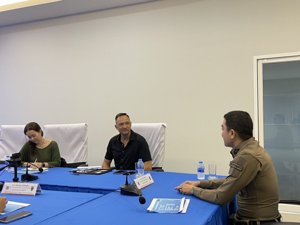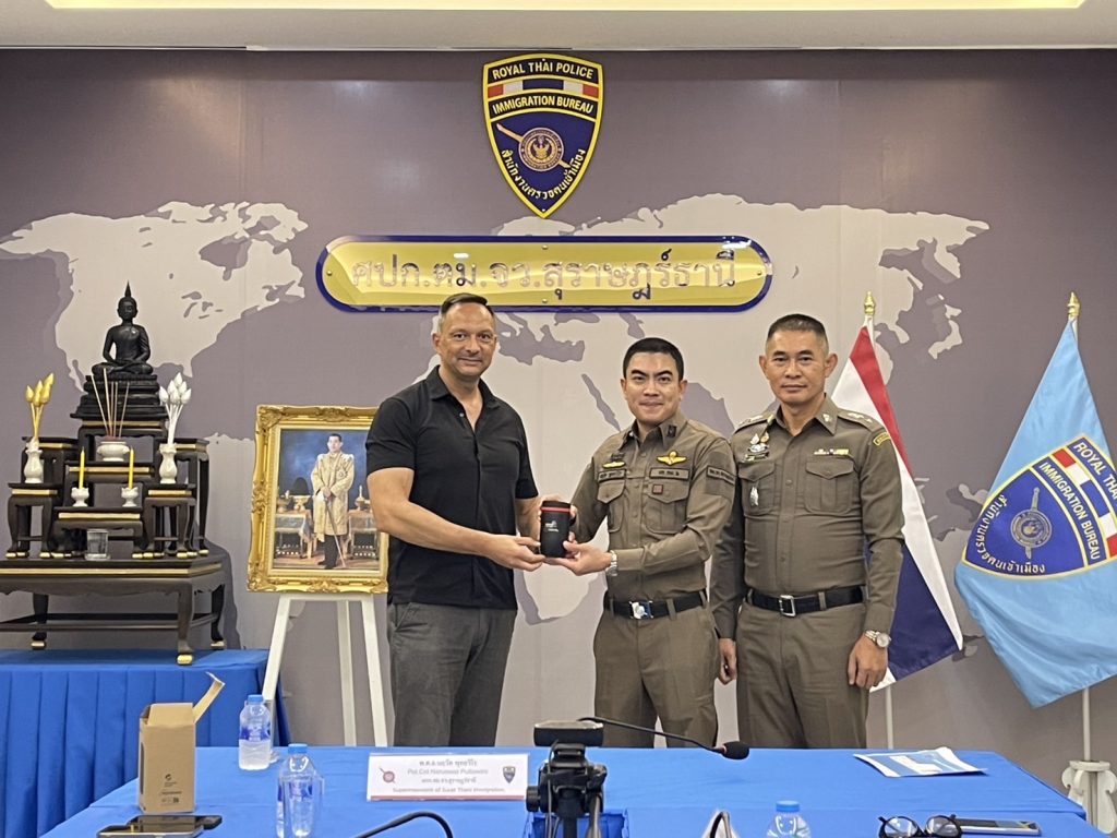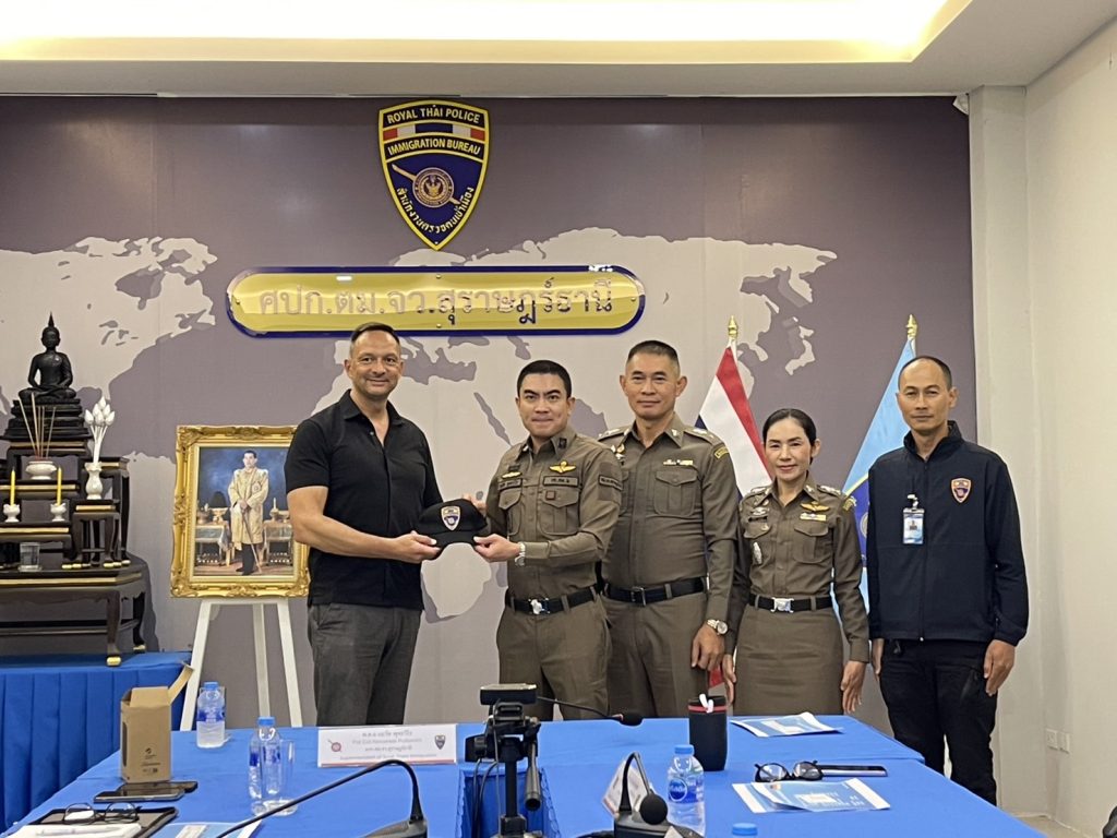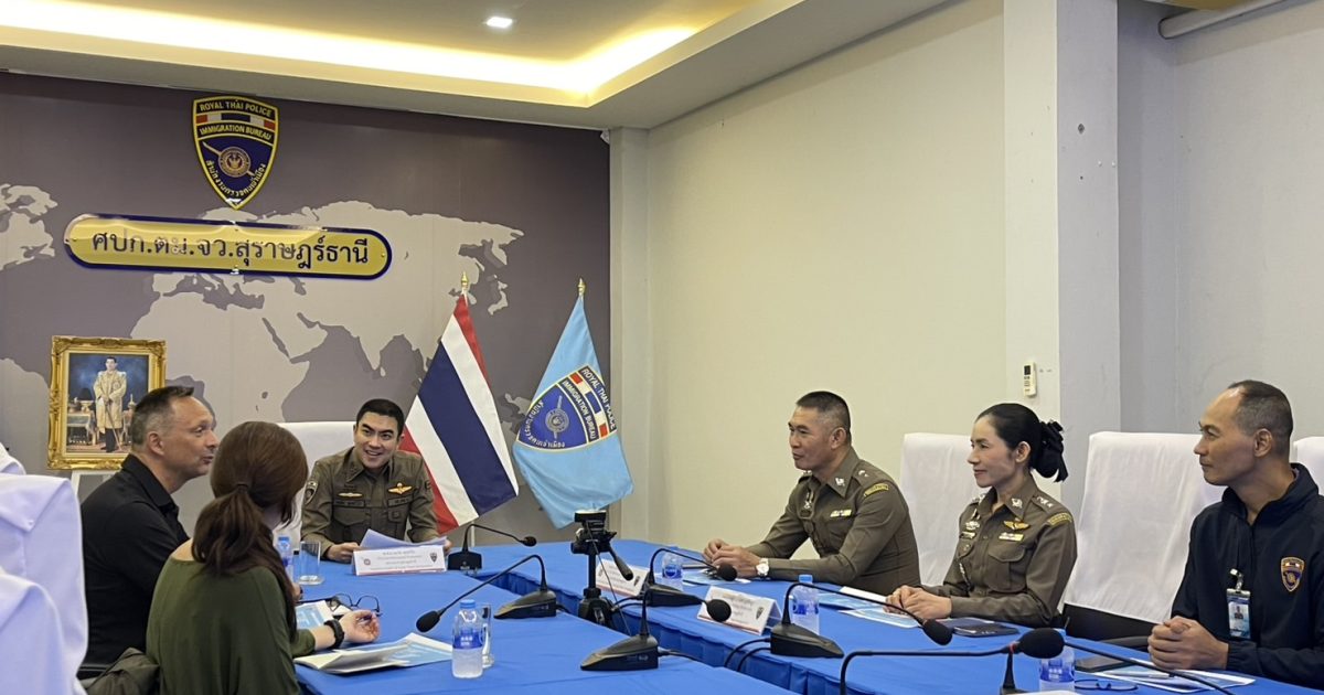 โดยมี พ.ต.อ.นฤวัต พุทธวิโร ผกก.ตม.จว.สุราษฎร์ธานี, พ.ต.ท.วัสส์ธนภูมิ กุลจิตติชุติพร รอง ผกก.ตม.จว.สุราษฎร์ธานี, ว่าที่ พ.ต.ท.หญิง ปาณิศา มุขรัษฎา สว.ตม.จว.สุราษฎร์ธานี และ ร.ต.อ.อรุณ มูสิกิ้ม รอง สว.ตม.จว.สุราษฎร์ธานี ให้การต้อนรับและได้ประชุมหารือ แลกเปลี่ยน รับทราบข้อมูลทั่วไป และขอความร่วมมือในการช่วยเหลือชาวเยอรมันในประเทศไทย