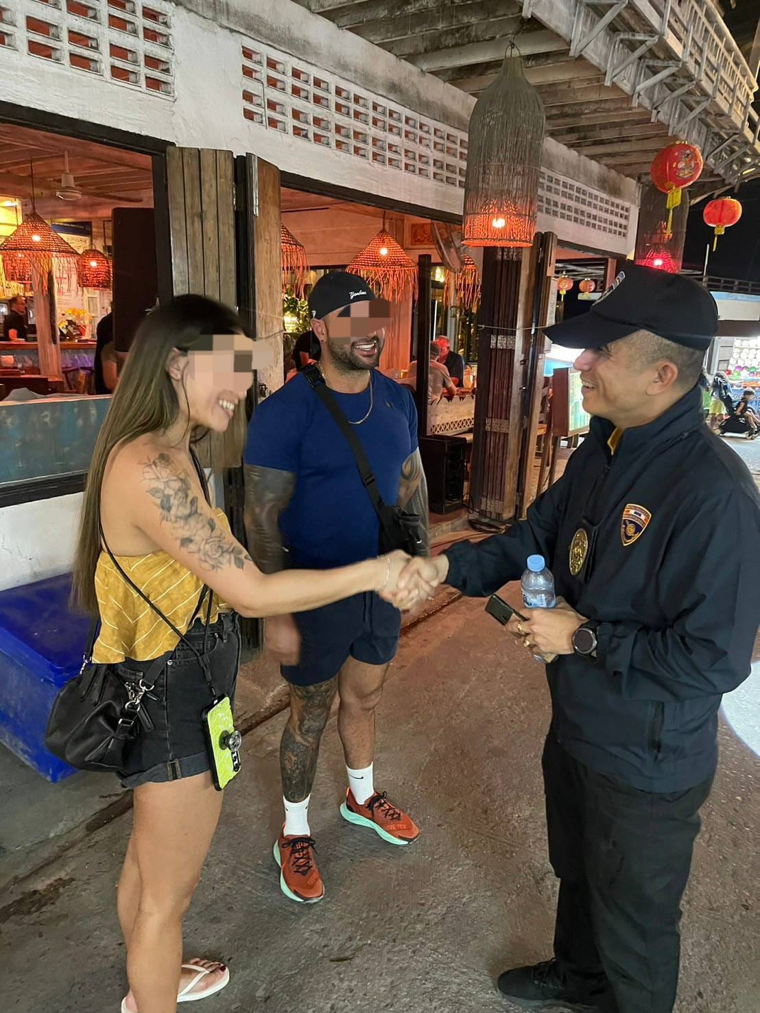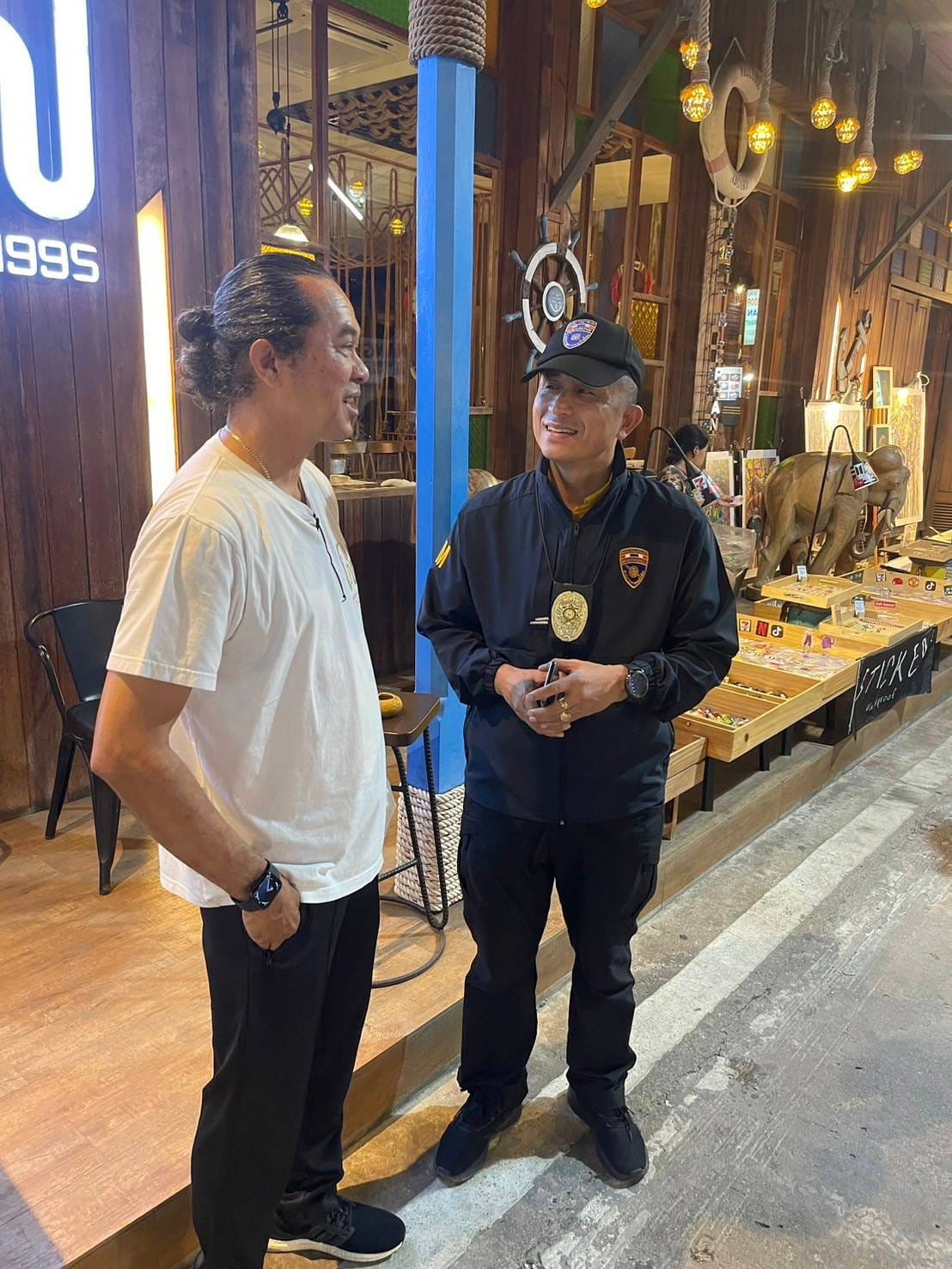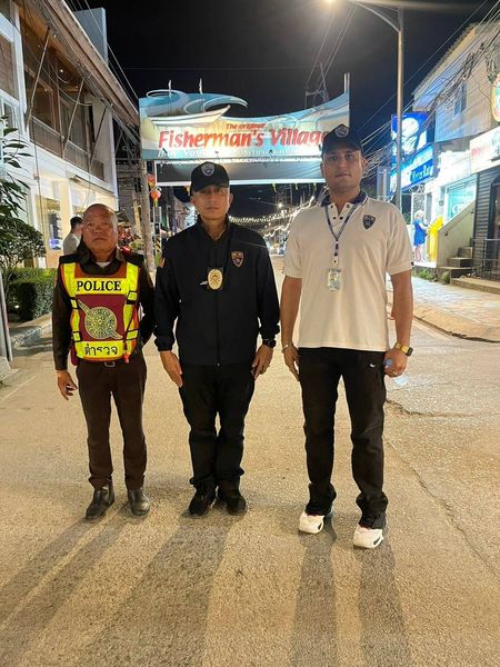ด.ต.พิศฐ์ศักดิ์ จันทโกมุท ผบ.หมู่ ตม.จว.สุราษฎร์ธานี ,นายอับดุล กาแดร์( MR.ABDUL QADIR) สัญชาติปากีสถาน ตม.อาสา พร้อมด้วยเจ้าหน้าที่ตำรวจท่องเที่ยว ส.ทท.5 กก.2 บก.ทท.3 บูรณาการร่วมสายตรวจเดินเท้าเพื่อดูแลความสงบเรียบร้อยตลอดจนอำนวยความสะดวกแก่ประชาชนและนักท่องเที่ยวตามนโยบายของผู้บังคับบัญชา โครงการ “สายตรวจเดินเท้าร่วมบูรณาการเพื่อชุมชนปลอดภัย” บริเวณพื้นที่ชุมชนฟิชเชอร์แมน วิลเลจ (Fisherman’s Village) ม.1 ต.บ่อผุด อ.เกาะสมุย จ.สุราษฎร์ธานี