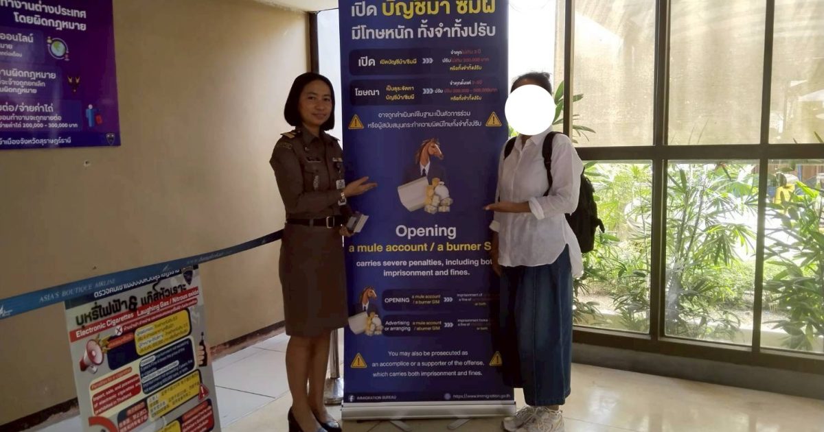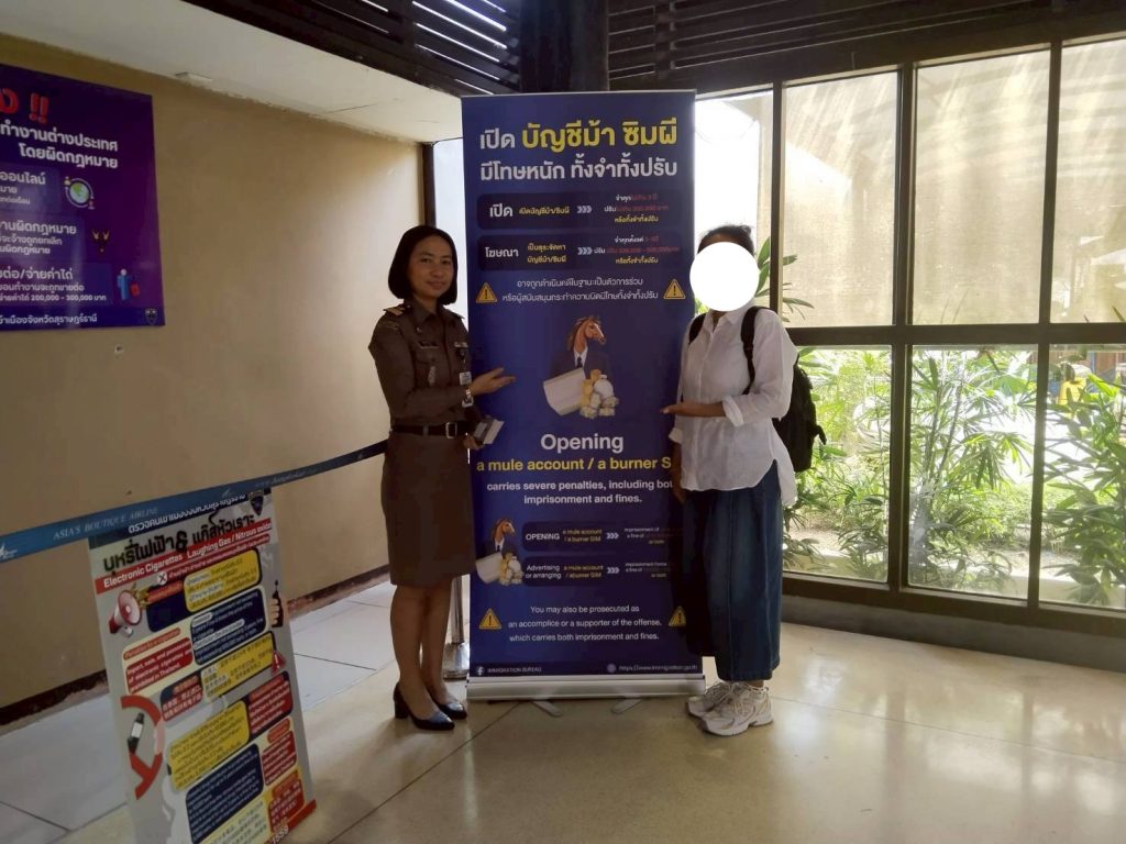 วันที่ 17/2/2569 ร.ต.อ.หญิง ภาวดี หวานทอง รอง สว.ตม.จว.สุราษฎร์ธานี พร้อมด้วยเจ้าหน้าที่ ตม.จว.สุราษฎร์ธานี (ทอ.สมุย) ประชาสัมพันธ์ให้ผู้โดยสารคนไทยและต่างชาติ จำนวน 1 คน ได้รับทราบถึงโทษทางกฎหมายที่เกี่ยวข้องกับ สแกมเมอร์ ซิมผี/บัญชีม้า ในเขตพื้นที่รับผิดชอบประจำสนามบินสมุย