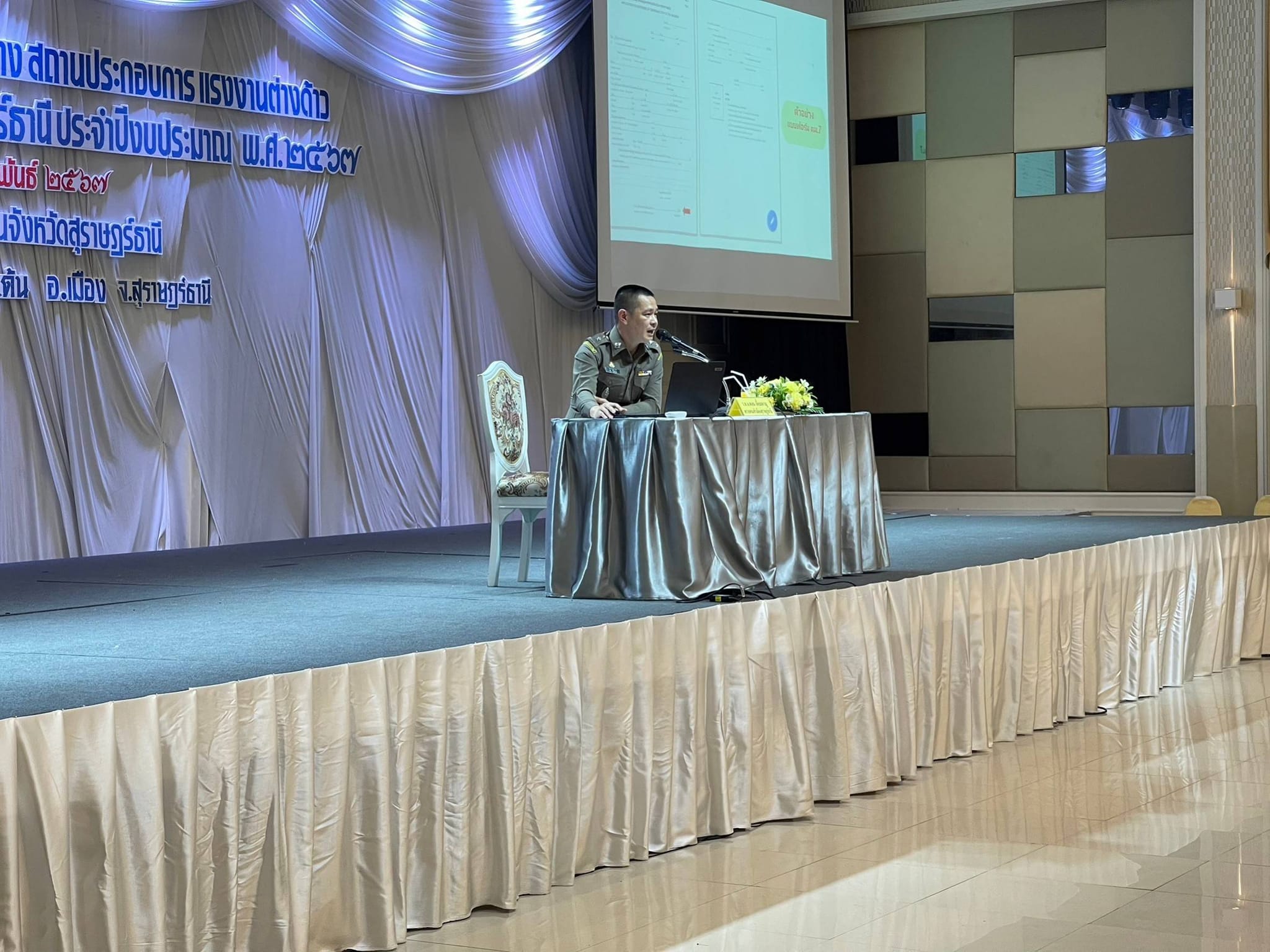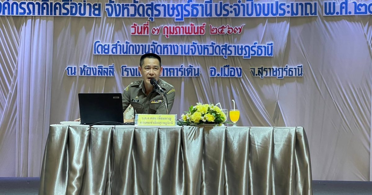 วันที่ 7 ก.พ.67 เวลา 14.30 น. พ.ต.อ.นฤวัต พุทธวิโร ผกก.ตม.จว.สุราษฎร์ธานี ,พ.ต.ท.พิงคะรัตน์ ซ้ายขวัญ รอง ผกก.ตม.จว.สุราษฎร์ธานีมอบหมายให้ ร.ต.อ.ดอน เหี้ยมหาญ รอง สว.ตม.จว.สุราษฎร์ธานี เข้าร่วมเป็นวิทยากร บรรยาย เรื่อง การขออยู่ต่อในราชอาณาจักรของแรงงานต่างด้าว 3 สัญชาติ ตามโครงการเสริมสร้างการรับรู้ให้กับนายจ้าง สถานประกอบการ แรงงานต่างด้าวและองค์กรภาคีจังหวัดสุราษฎร์ธานี ประจำปีงบประมาณ 2567 ณ ห้องลิลลี่ 1 โรงแรมนิภาการ์เด้น ถ.เลี่ยงเมือง ต.มะขามเตี้ย อ.เมือง จ.สุราษฎร์ธานี