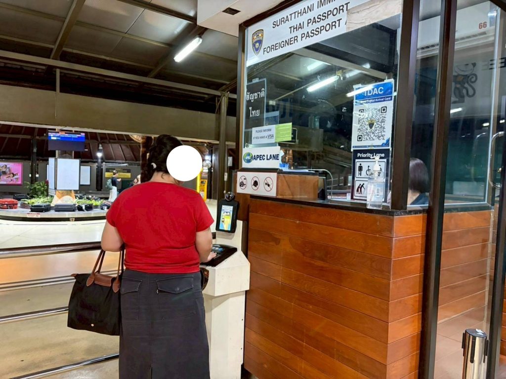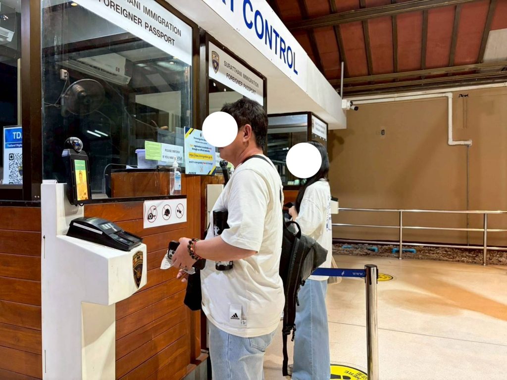 วันที่ 15/12/2568 เวลา 20.58 น. ร.ต.อ.หญิง ภาวดี หวานทอง รอง สว.ตม. จว. สุราษฎร์ธานี พร้อมด้วยเจ้าหน้าที่ ตม.จว. สุราษฎร์ ธานี (ทอ.สมุย) ปฏิบัติหน้าที่ตรวจบุคคลและพาหนะทางอากาศให้กับผู้โดยสารที่เดินทางเข้า เที่ยวบิน PG962 ในเขตพื้นที่รับผิดชอบประจำสนามบินสมุย