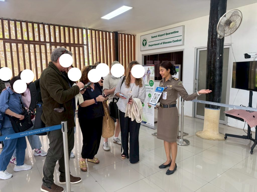 วันที่ 20/12/2568 เวลา 17.40 น. ร.ต.อ.ธฤติพัฒน์ สมมะลวน รอง สว.ตม.จว.สุราษฎร์ธานี พร้อมด้วยเจ้าหน้าที่ ตม.จว.สุราษฎร์ธานี (ทอ.สมุย) ปฏิบัติหน้าที่ตรวจบุคคลและพาหนะทางอากาศให้กับผู้โดยสารที่เดินทางเข้าเที่ยวบิน TR694 ในเขตพื้นที่รับผิดชอบประจำสนามบินสมุย