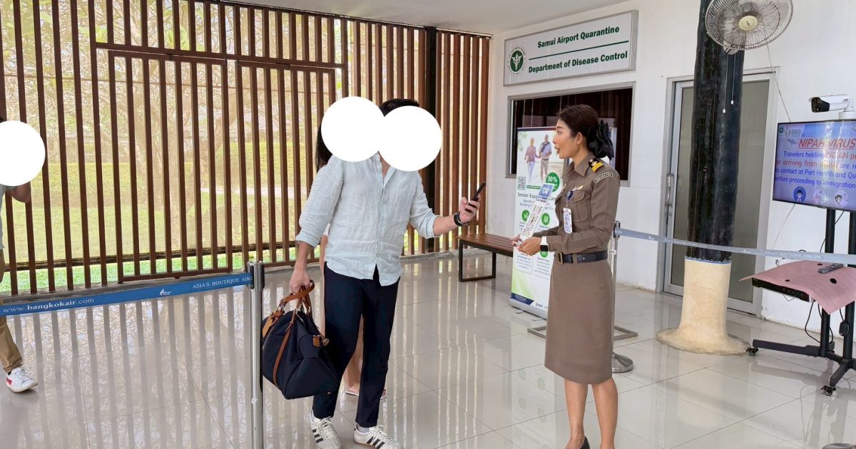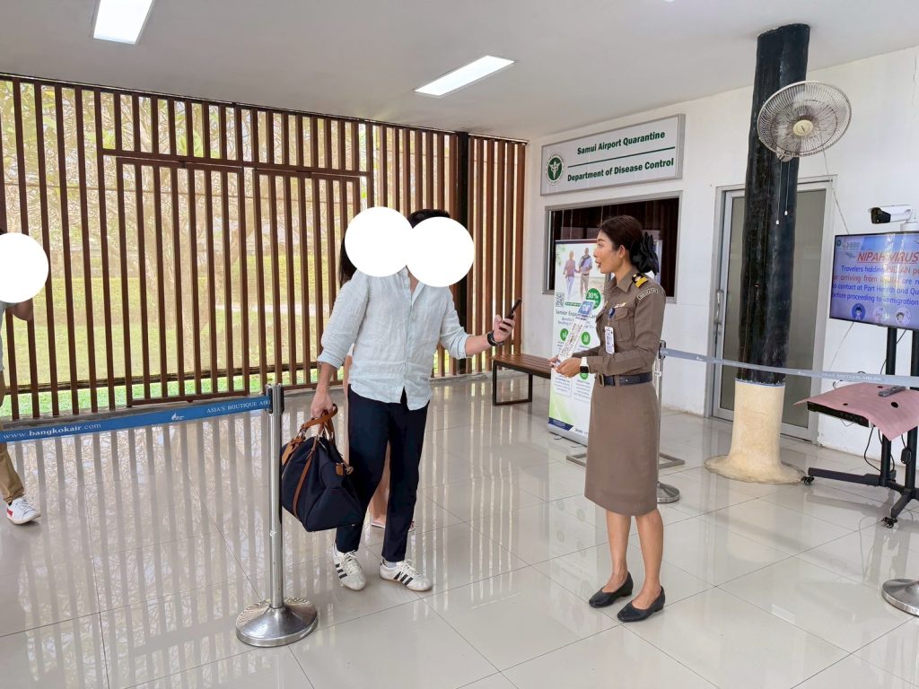 วันที่ 27/1/2569 เวลา 12.30 น. ร.ต.อ.ธฤติพัฒน์ สมมะลวน รอง สว.ตม.จว.สุราษฎร์ธานี พร้อมด้วยเจ้าหน้าที่ ตม.จว.สุราษฎร์ธานี (ทอ.สมุย) ปฏิบัติหน้าที่ตรวจบุคคลและพาหนะทางอากาศให้กับผู้โดยสารที่เดินทางเข้าเที่ยวบิน PG966 ในเขตพื้นที่รับผิดชอบประจำสนามบินสมุย