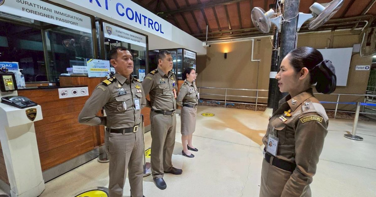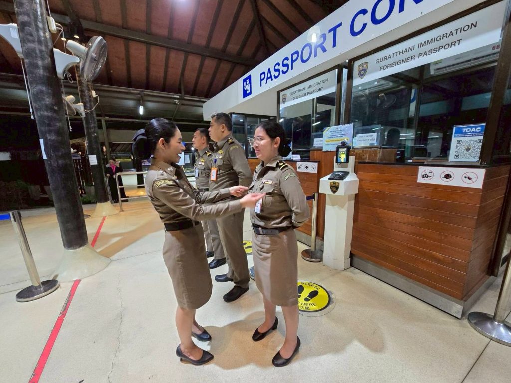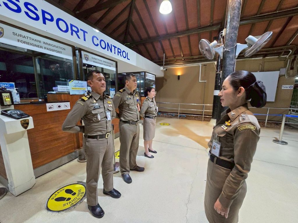 วันที่ 24/10/2568 เวลา 18.00 น. ร.ต.อ.ธฤติพัฒน์ สมมะลวน รอง สว.ตม.จว.สุราษฎร์ธานี พร้อมด้วยเจ้าหน้าที่ ตม.จว.สุราษฎร์ธานี (ทอ.สมุย) ปฏิบัติหน้าที่ตรวจบุคคลและพาหนะทางอากาศให้กับผู้โดยสารที่เดินทางเข้าเที่ยวบิน PG968 ในเขตพื้นที่รับผิดชอบประจำสนามบินสมุย