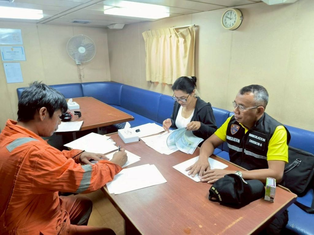 วันที่ 9 เม.ย.68 ร.ต.อ.หญิง ธมนวรรณ มณี รอง สว.ตม.จว.สุราษฎร์ธานี ,ร.ต.ท.ผดุงศักดิ์ แยบกระโทก รอง สว (อก.) ตม.จว.สุราษฎร์ธานี ,ด.ต.หญิง พิมประภา จันทร์ขาว ปฏิบัติหน้าที่ตรวจบุคคลและพาหนะทางน้ำ ในเขตพื้นที่รับผิดชอบ ประจำท่าเรืออ่าวบ้านดอน อ.เมือง จว.สุราษฎร์ธานี