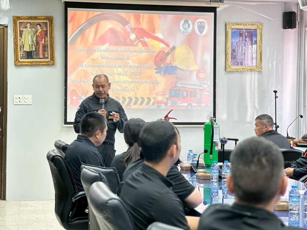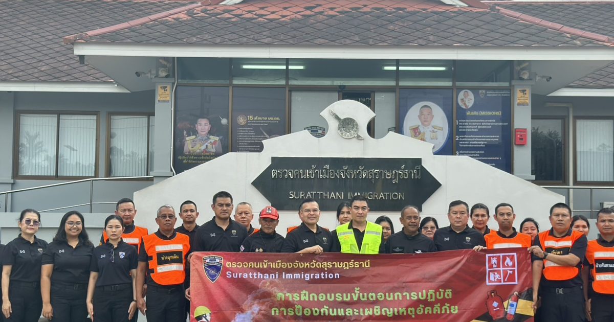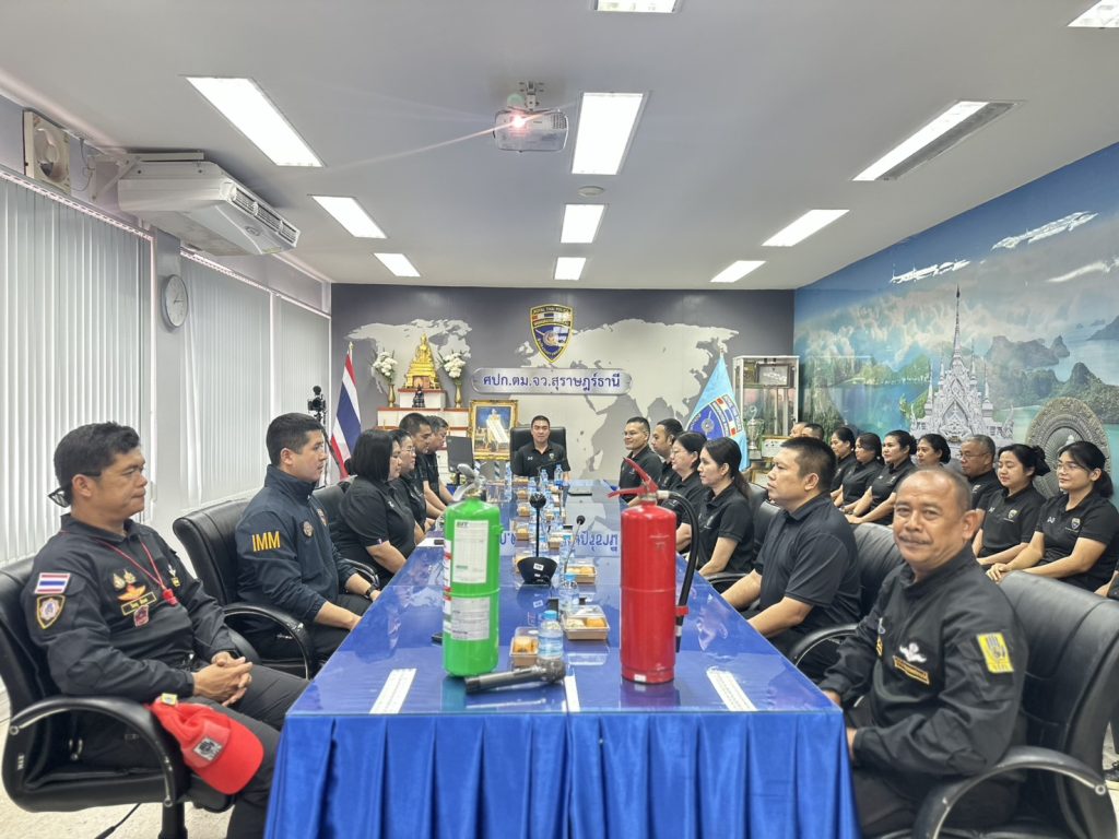 สำนักงานป้องกันและบรรเทาสาธารณภัยจังหวัดสุราษฎร์ธานีเป็นวิทยากรในโครงการฝึกอบรมขั้นตอนการปฏิบัติการป้องกันและเผชิญเหตุอัคคีภัย ให้ ตม.จว.สุราษฎร์ธานี โดยมี พ.ต.อ.นฤวัต พุทธวิโร ผกก.ตม.จว.สุราษฎร์ธานี,