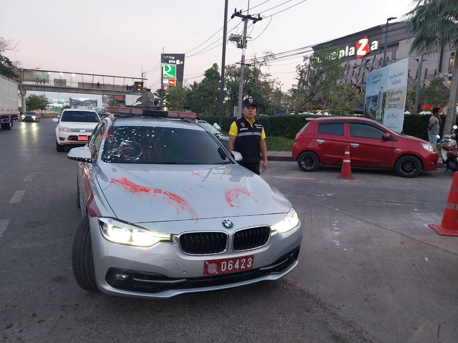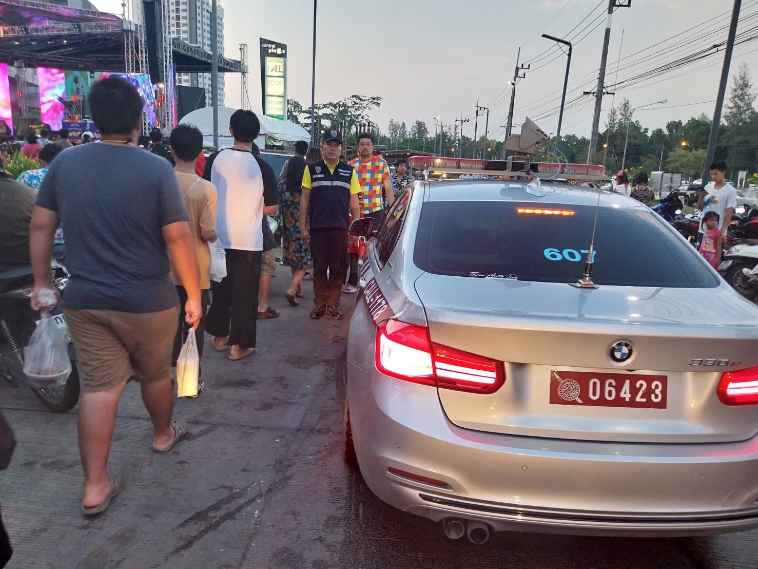 วันที่ 13 เม.ย.2567 เวลา 18.30 น. ร.ต.อ.ยศวีร์ รักธง รอง สว.ตม.จว.สุราษฎร์ธานี พร้อมเจ้าหน้าที่สืบสวนปราบปราม นำรถยนต์ตรวจการณ์ไฟฟ้าอัจฉริยะ (SMART PATROL CAR:SPC) ออกปฏิบัติหน้าที่ดูแลความปลอดภัย งานเทศกาลวันสงกรานต์ ประจำปี พ.ศ.2567 บริเวณหน้าห้างเซ็นทรัลพลาซ่าสุราษฎร์ธานี เหตุการณ์ทั่วไปปกติ