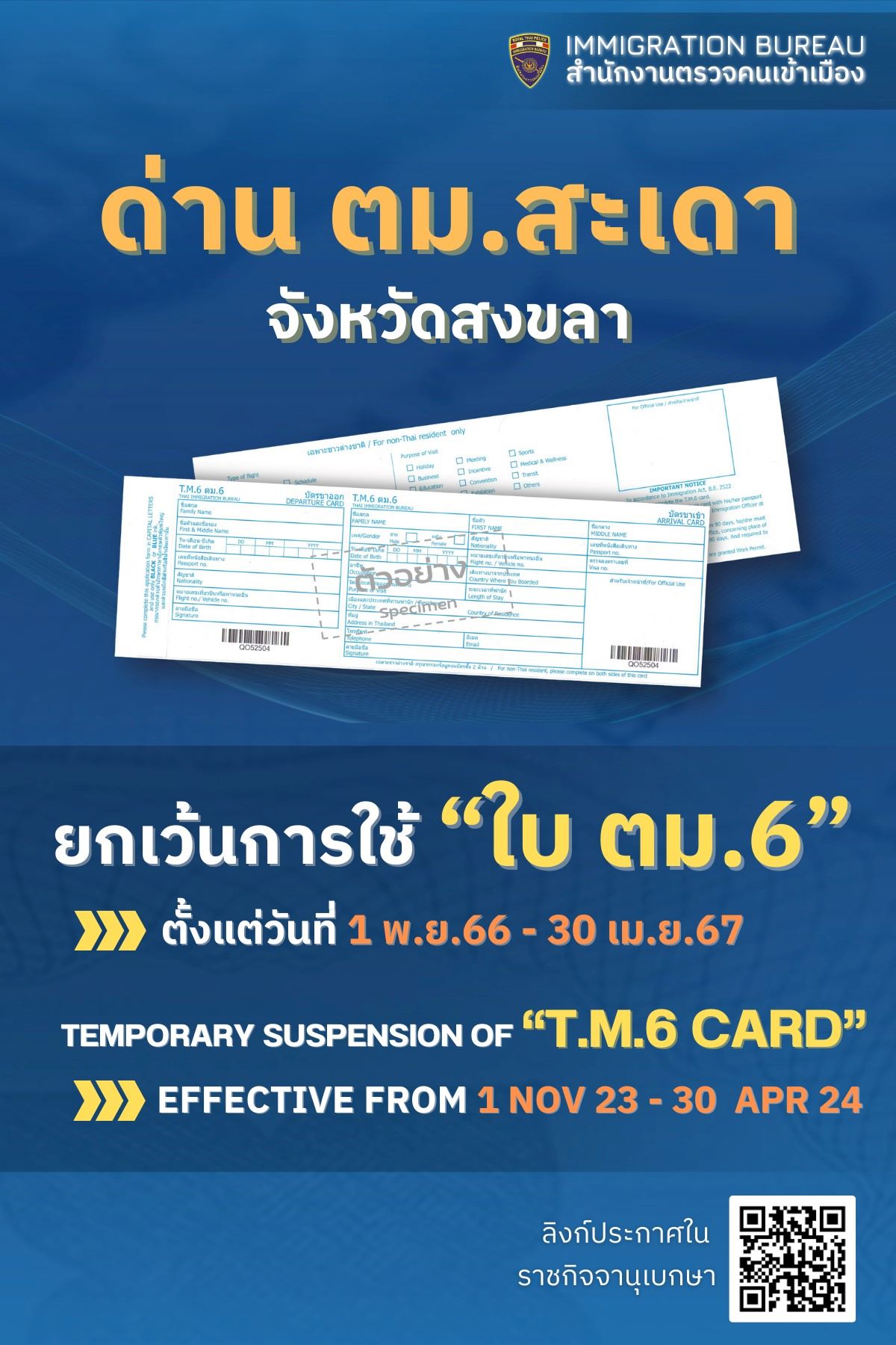 ประกาศราชกิจจานุเบกษาแล้ว ยกเว้นการยื่น ตม.6 ณ ด่าน ตม.สะเดา จังหวัดสงขลา มีผลตั้งแต่ 1 พ.ย.66 ̵