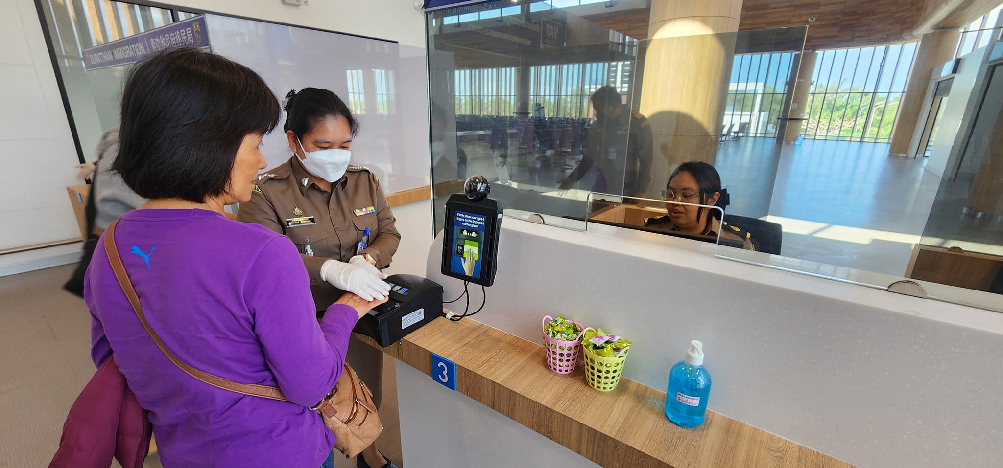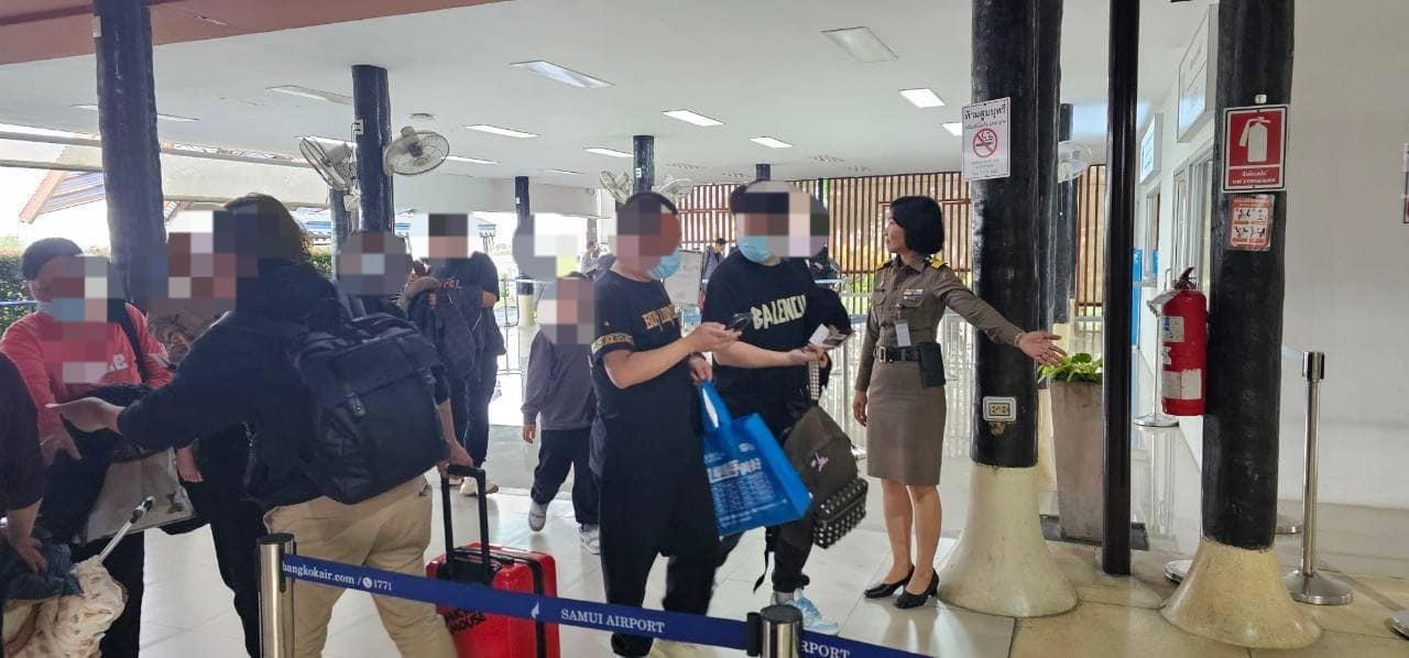เจ้าหน้าที่ ตม.จว.สุราษฎร์ธานี (ทอ.สมุย) ดูแลอำนวยความสะดวกหน้าช่องตรวจให้กับผู้โดยสารที่เดินทางเข้าราชอาณาจักร ผ่านทางสนามบินสมุย