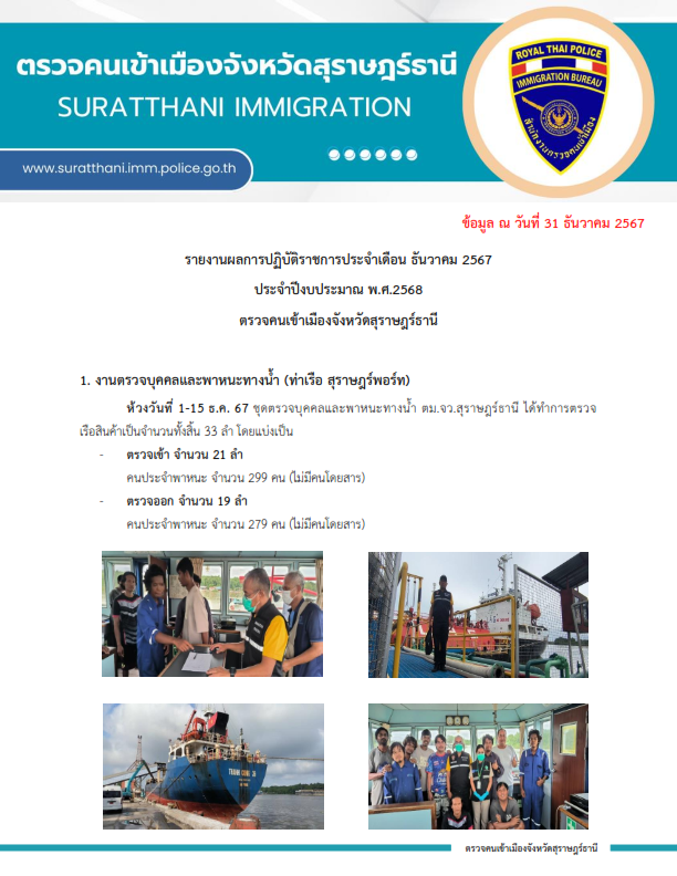 วันที่ 31 ธ.ค.67 ร.ต.อ.ปิติพงษ์ เสนชู รอง สว.ตม.จว.สุราษฎร์ธานี ,ร.ต.อ.หญิง ภาวดี หวานทอง ,ร.ต.อ.หญิ