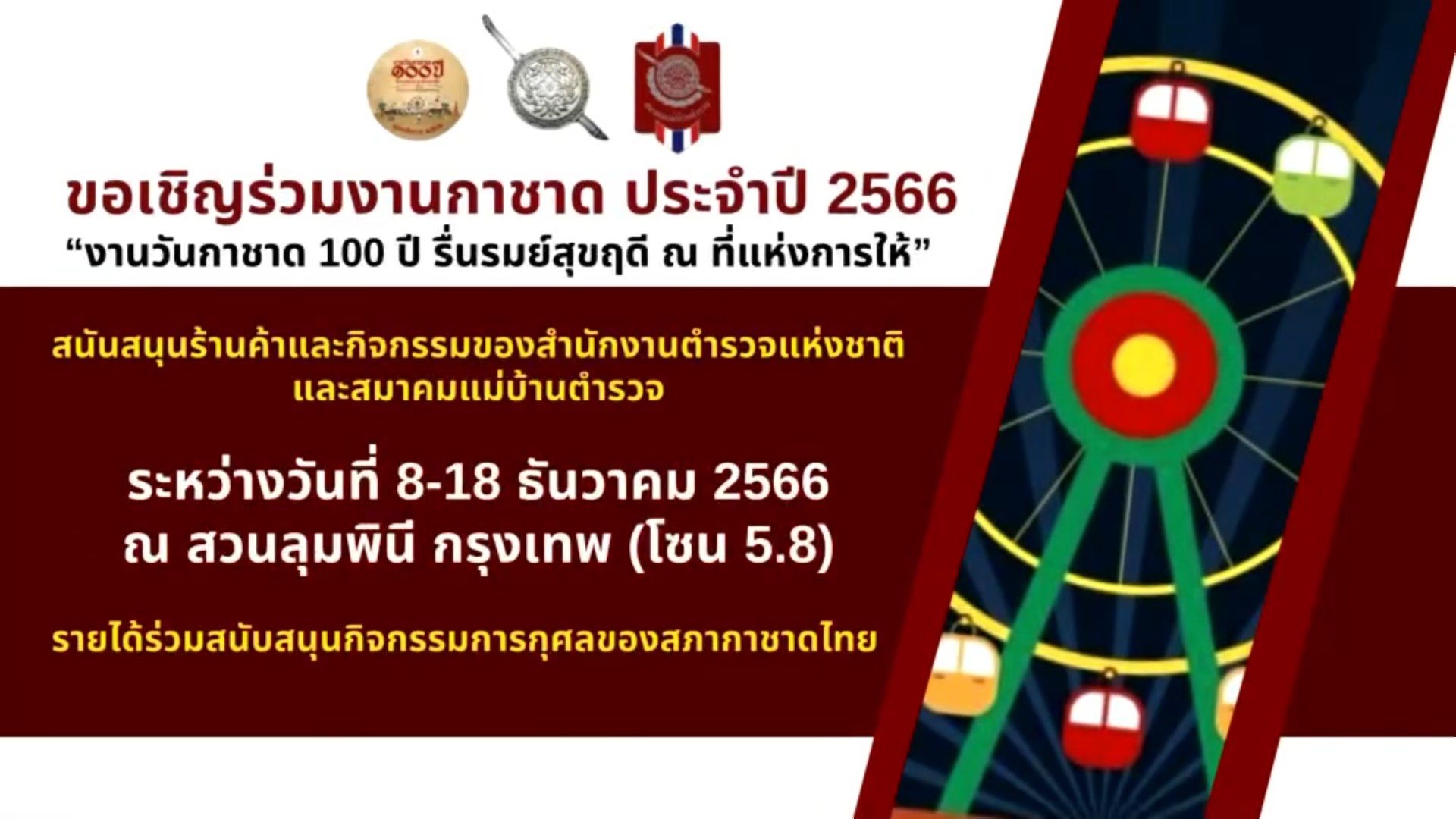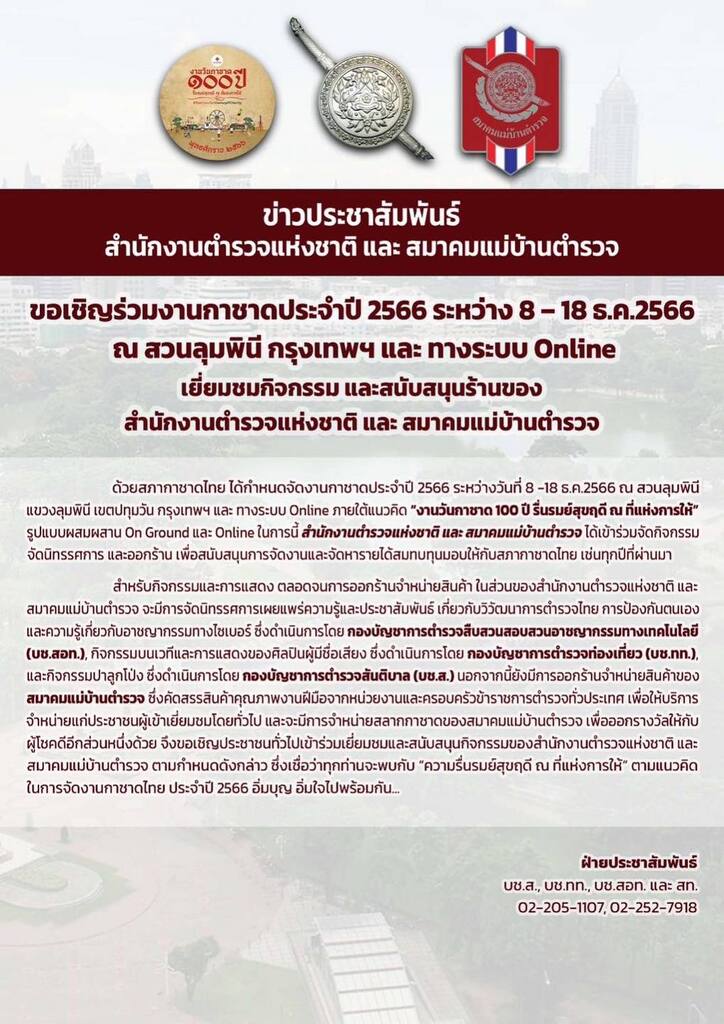 สำนักงานตำรวจแห่งชาติ และสมาคมแม่บ้านตำรวจ ขอเชิญชวนเข้าร่วมงานกาชาดประจำปี 2566 ระหว่างวันที่ 8