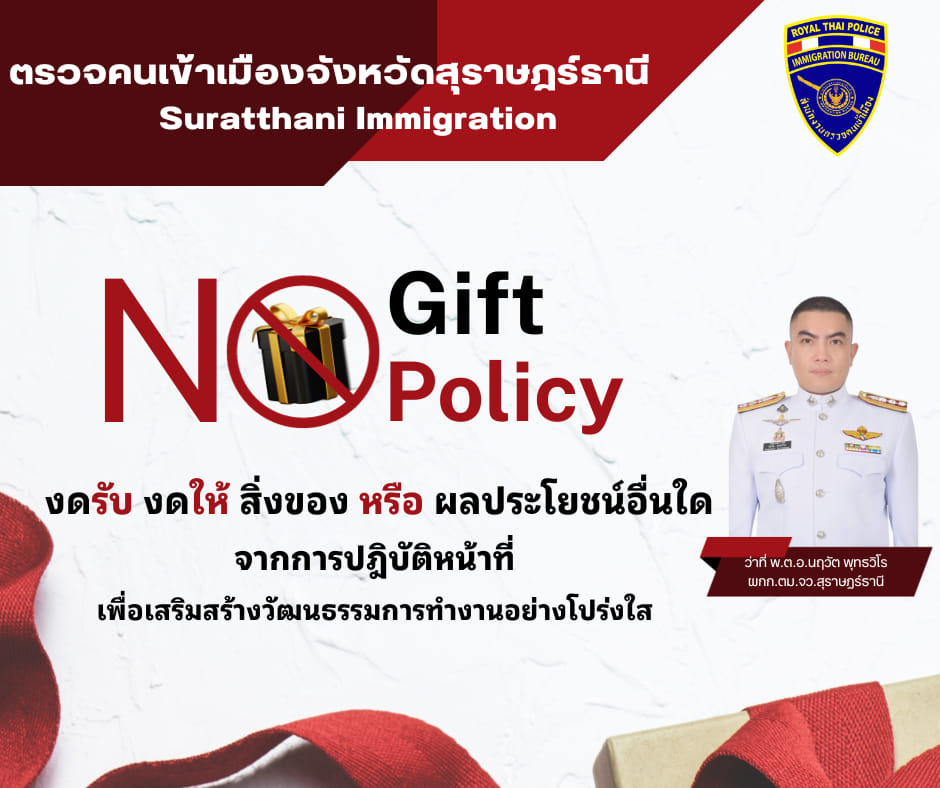 ตรวจคนเข้าเมืองจังหวัดสุราษฎร์ธานี ประกาศเจตนารมย์ งบรับ งดให้ ของขวัญ กระเช้า หรือของกำนัลทุกชนิด ร
