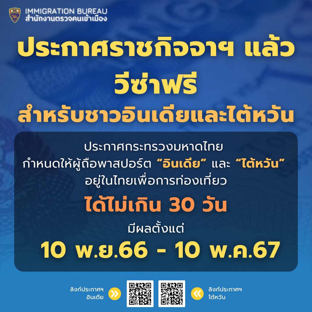 ประกาศราชกิจจาฯ แล้ว “วีซ่าฟรี” สำหรับชาวอินเดียและไต้หวัน ประกาศกระทรวงมหาดไทย กำหนดให้