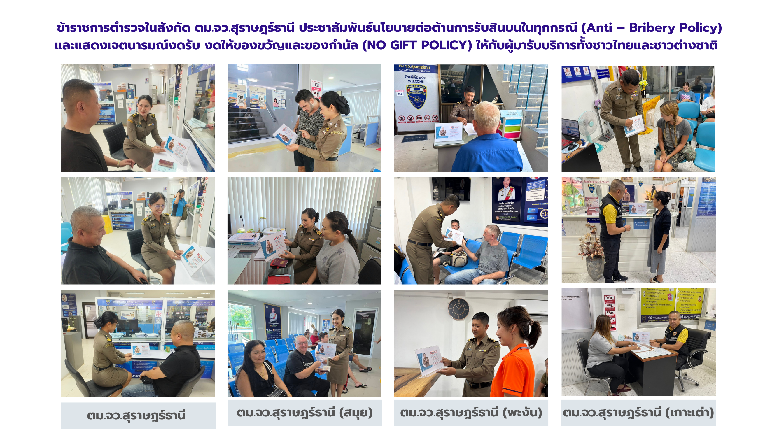 ผกก.ตม.จว.สุราษฎร์ธานี ประชาสัมพันธ์นโยบายต่อต้านการรับสินบนในทุกกรณี (Anti – Bribery Policy) และแสดงเจตนารมณ์งดรับ งดให้ของขวัญและของกำนัล (NO GIFT POLICY)