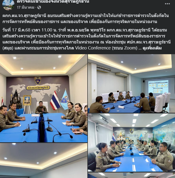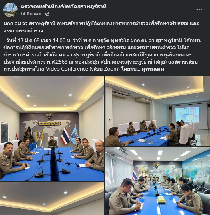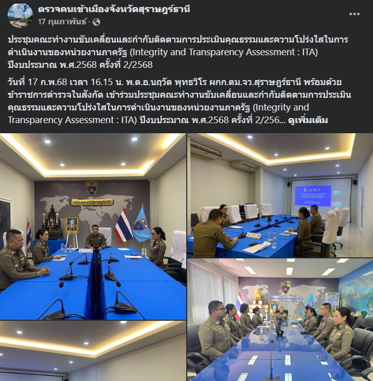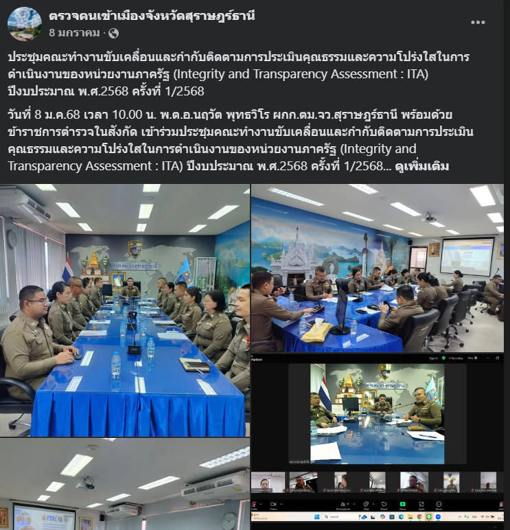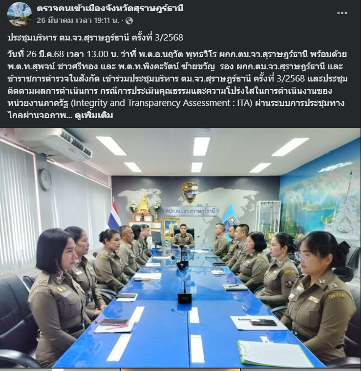 ตม.จว.สุราษฎร์ธานี ประชุมติดตามผลการดำเนินการ กรณีการประเมินคุณธรรมและความโปร่งใสในการดำเนินงานของหน่วยงานภาครัฐ (Integrity and Transparency Assessment : ITA) ครั้งที่ 4/2568 ผ่านระบบการประชุมทางไกลผ่านจอภาพ ระบบ Zoom ณ ห้องประชุม ศปก.ตม.จว.สุราษฎร์ธานี
