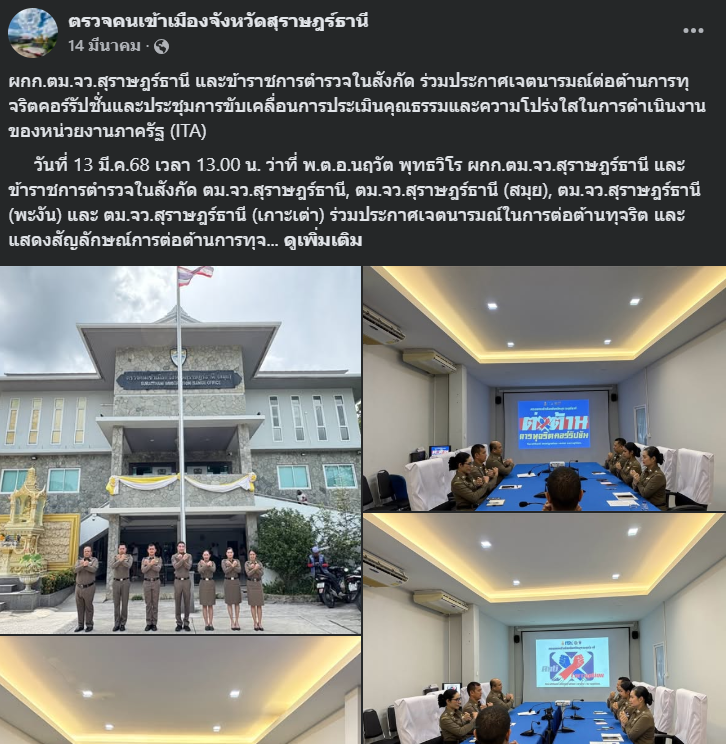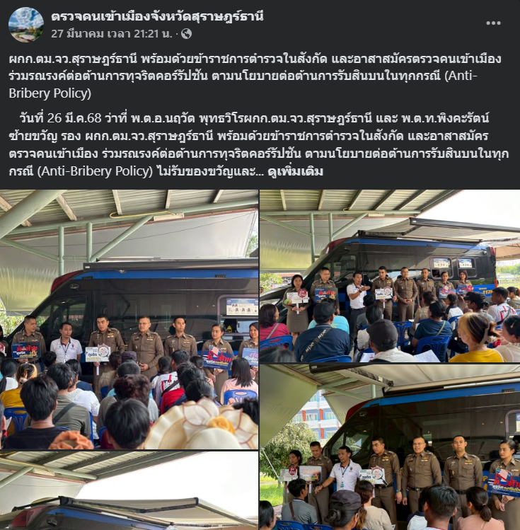 ผกก.ตม.จว.สุราษฎร์ธานี พร้อมด้วยข้าราชการตำรวจในสังกัด และอาสาสมัครตรวจคนเข้าเมือง ร่วมรณรงค์ต่อต้านการทุจริตคอร์รัปชัน ตามนโยบายต่อต้านการรับสินบนในทุกกรณี (Anti-Bribery Policy)