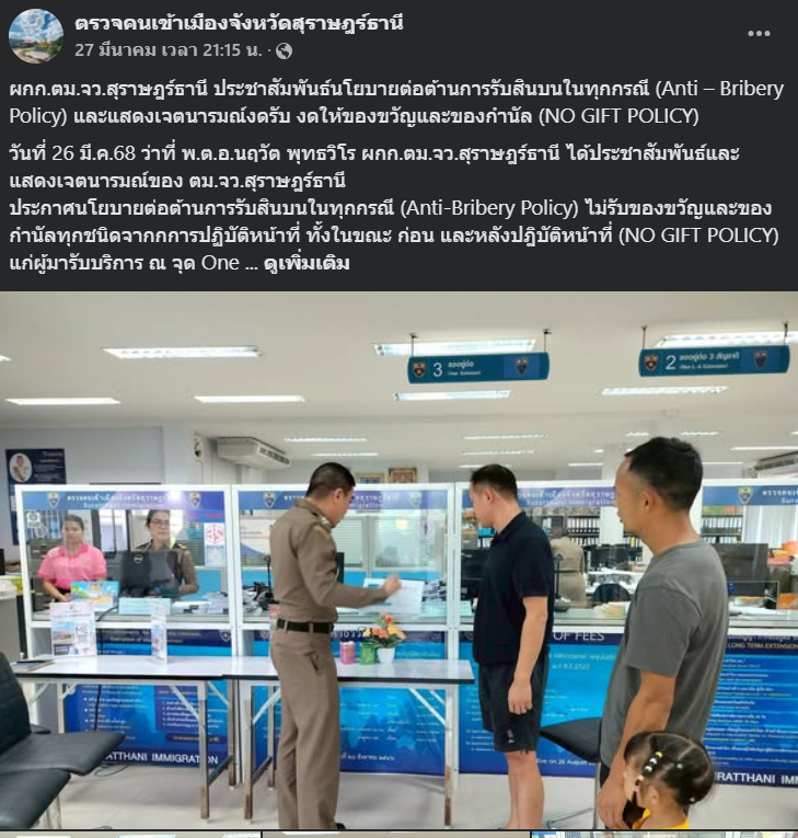 ผกก.ตม.จว.สุราษฎร์ธานี ประชาสัมพันธ์นโยบายต่อต้านการรับสินบนในทุกกรณี (Anti – Bribery Policy) และแสด