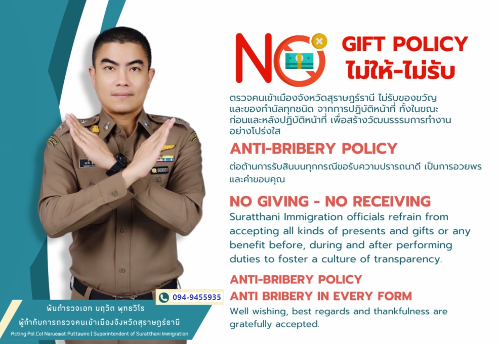 ตม.จว.สุราษฎร์ธานี ประกาศเจตนารมณ์ที่จะไม่รับของขวัญหรือของกำนัลทุกชนิดจากการปฏิบัติหน้าที่ (No Gift Policy) ประจำปีงบประมาณ พ.ศ.๒๕๖๙