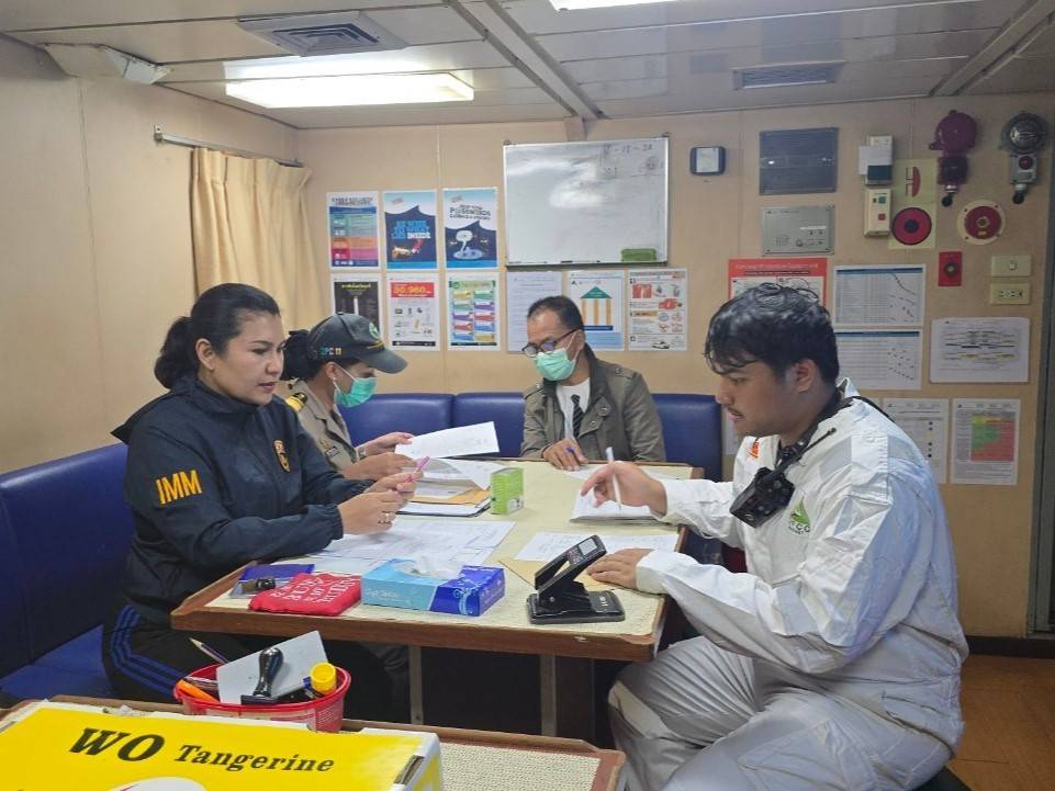เจ้าหน้าที่ตรวจบุุคคลและพาหนะทางน้ำ ที่เดินทางเข้า-ออกทางน้ำในเขตพื้นที่รับผิดชอบ เรือ MT.TASCO PHOENIX คนประจำพาหนะ 14 คน สัญชาติไทย 14 คน