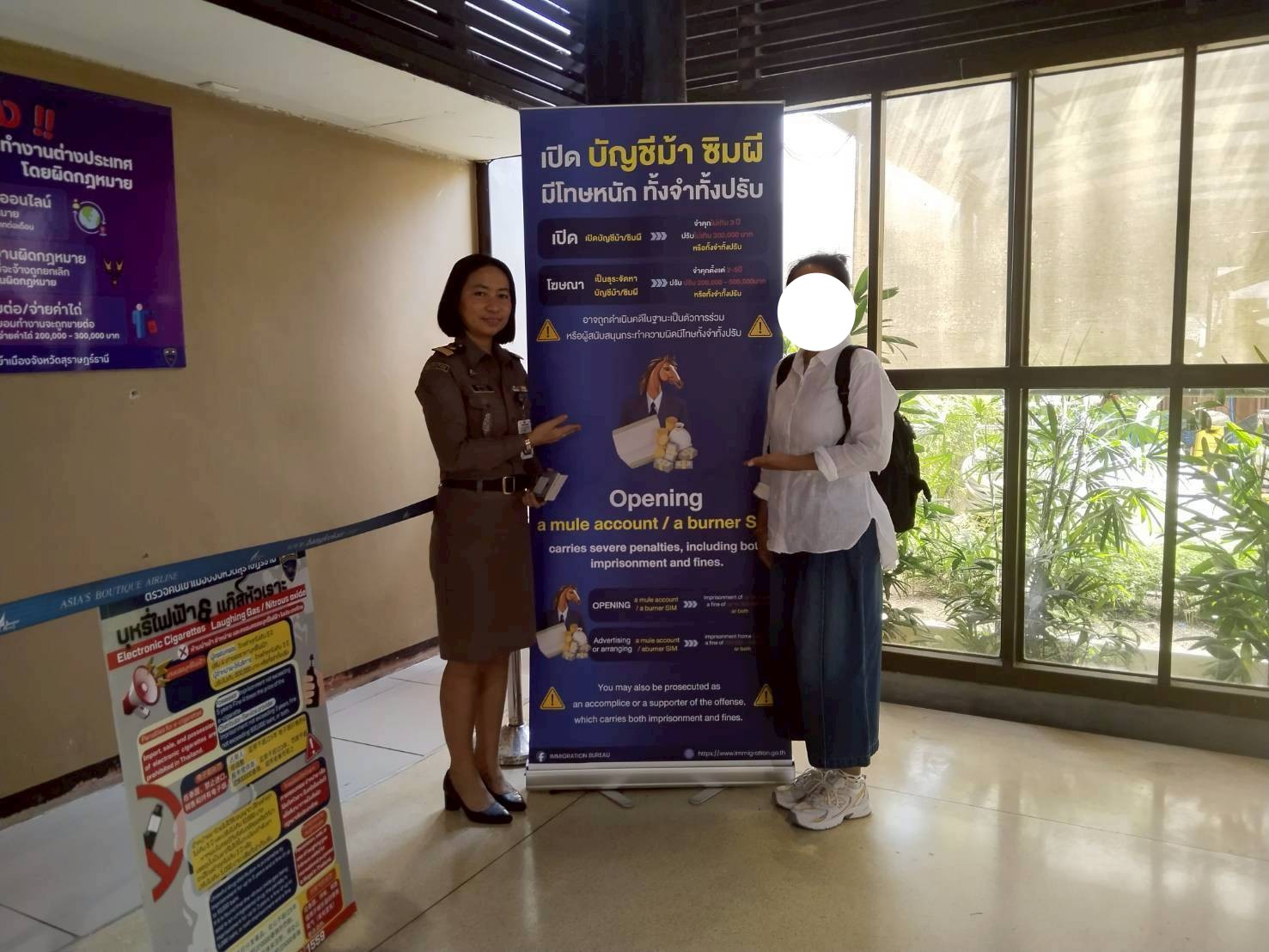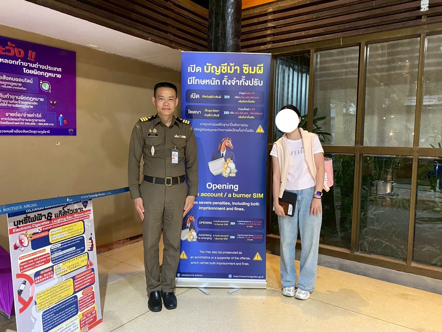 เจ้าหน้าที่ ตม.จว.สุราษฎร์ธานี (ทอ.สมุย) ประชาสัมพันธ์ให้ผู้โดยสารคนไทยและต่างชาติ ได้รับทราบถึงโทษทางกฎหมายที่เกี่ยวข้องกับ สแกมเมอร์ ซิมผี/บัญชีม้า